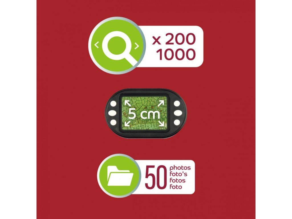 Vďaka nastaviteľnému zväčšeniu od 200× do 1000×, LED osvetleniu a presnému zaostrovaciemu systému získate vždy ostrý a jasný obraz. Pozorovanie je jednoduché vďaka zabudovanej 5 cm obrazovke, na ktorej môžete sledovať všetko priamo počas skúmania.