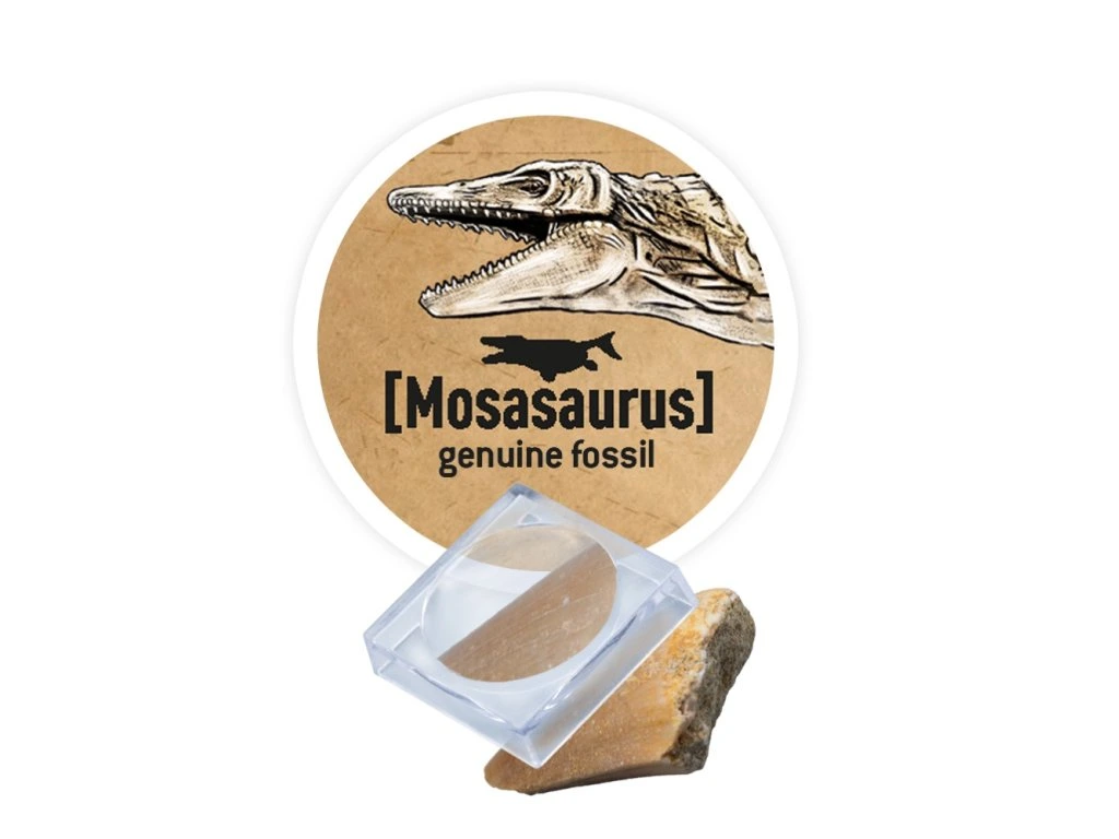 Ako bonus súčasťou sady nájdeš aj skutočný zub Mosasaura (cca 2 cm), ktorý môžeš pozorovať pod lupou v prenosnej zväčšovacej krabičke – ideálny na skúmanie aj nosenie so sebou.