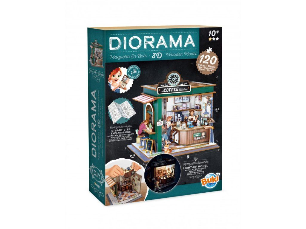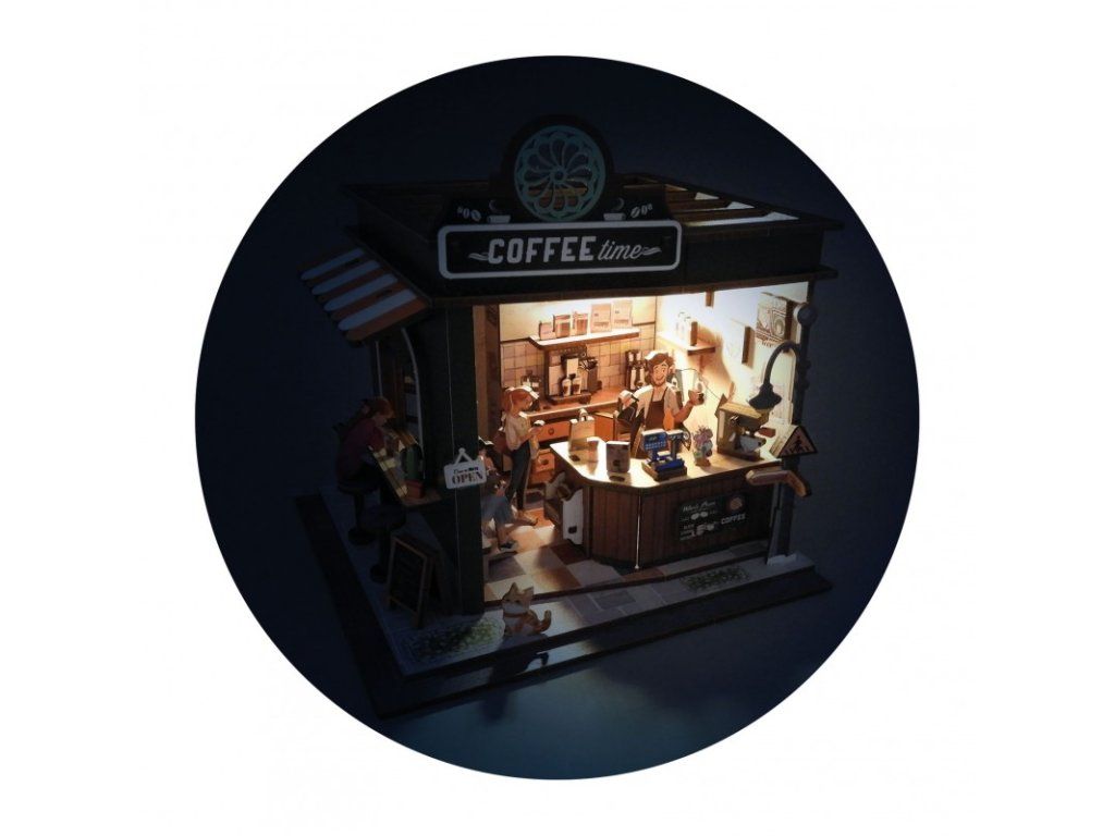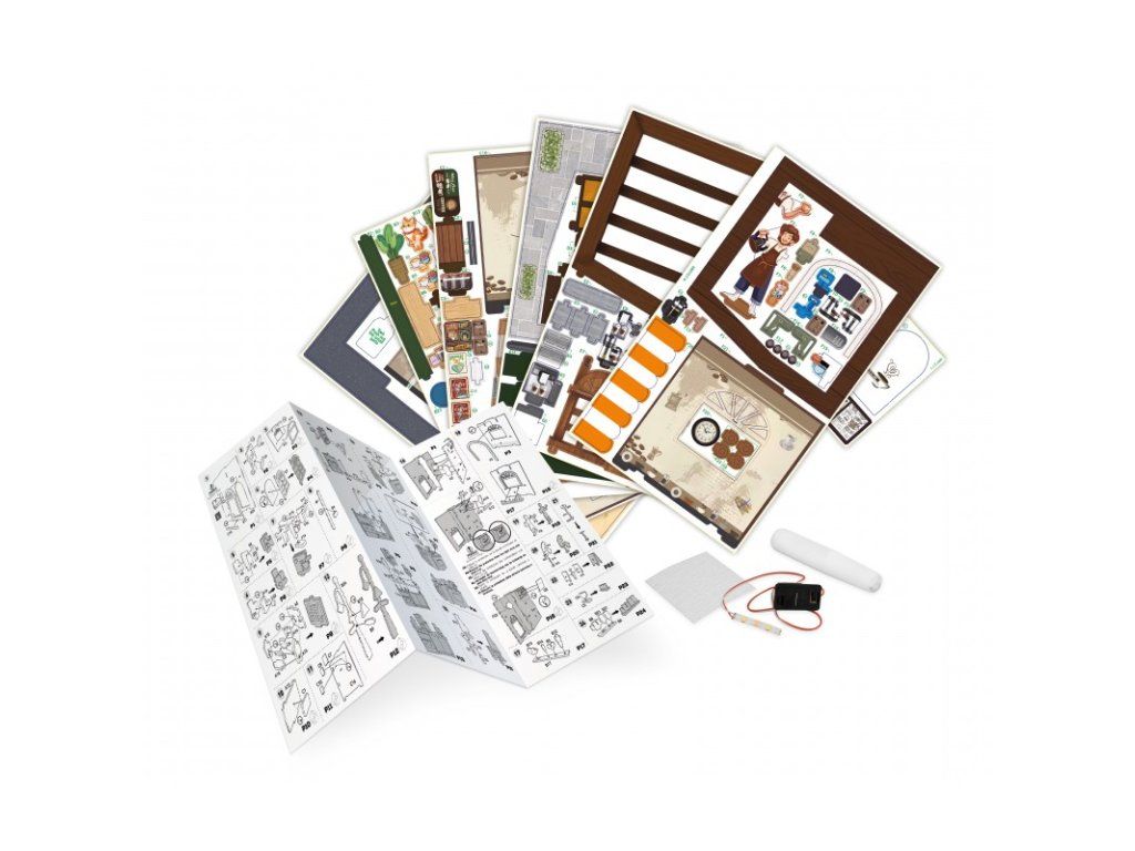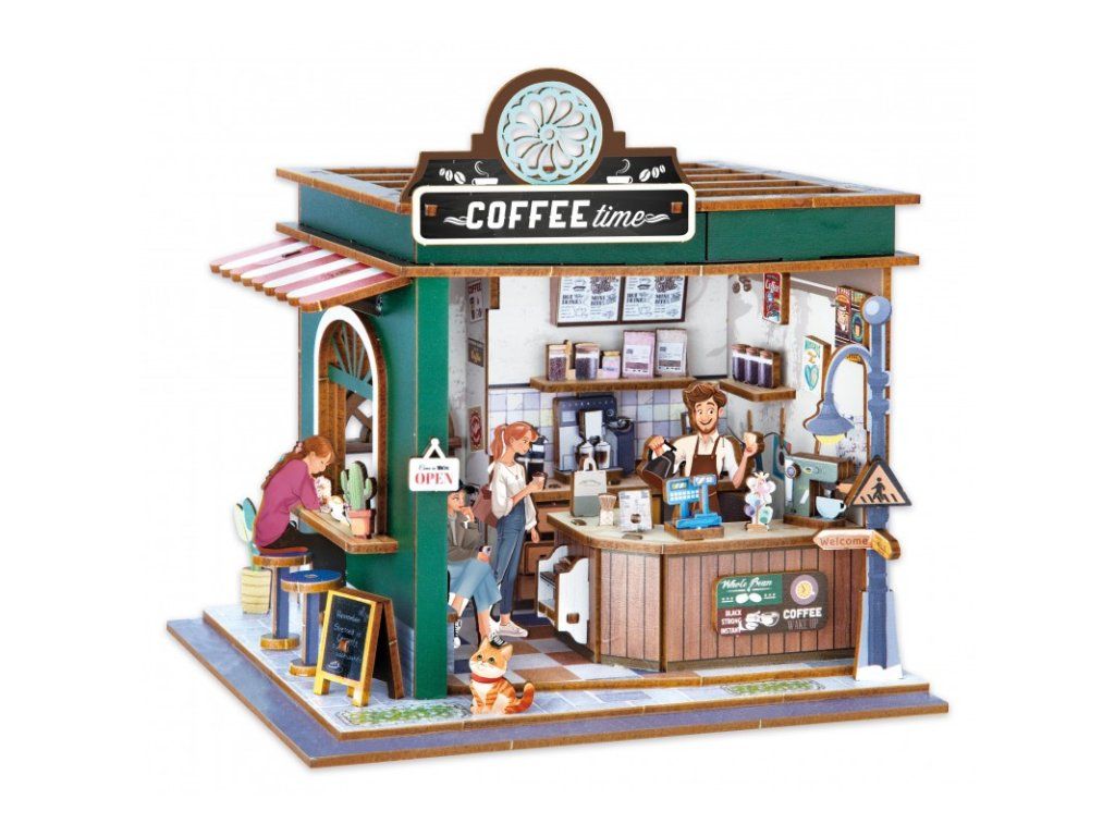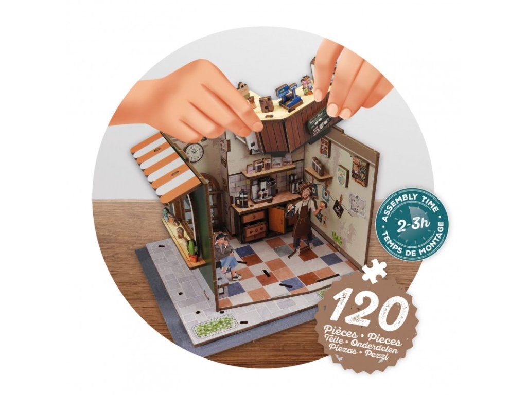 Zostavte drevené diely a postavte si vlastnú miniatúrnu kaviareň. Vytvorte si útulnú atmosféru pomocou detailne spracovaných prvkov – lepte, strihajte a umiestňujte nábytok, doplnky, rastliny aj zákazníkov presne podľa vašej predstavy. Vďaka očíslovaným dielom a prehľadnému návodu je skladanie jednoduché a zábavné.